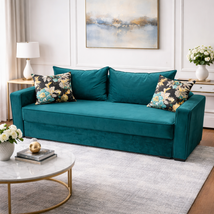 Canapea LARISA extensibila, 3 locuri, cu lada de depozitare, catifea turcoaz , 220x95x85