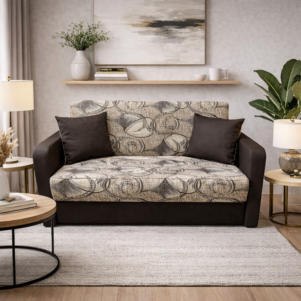 Canapea SAMY extensibila, 2 locuri, cu lada de depozitare, stofa crem cu maro, cadru metalic, 152x100x92