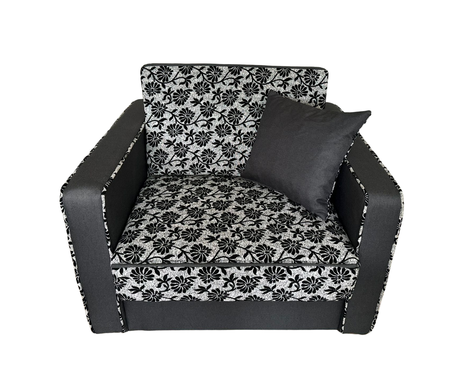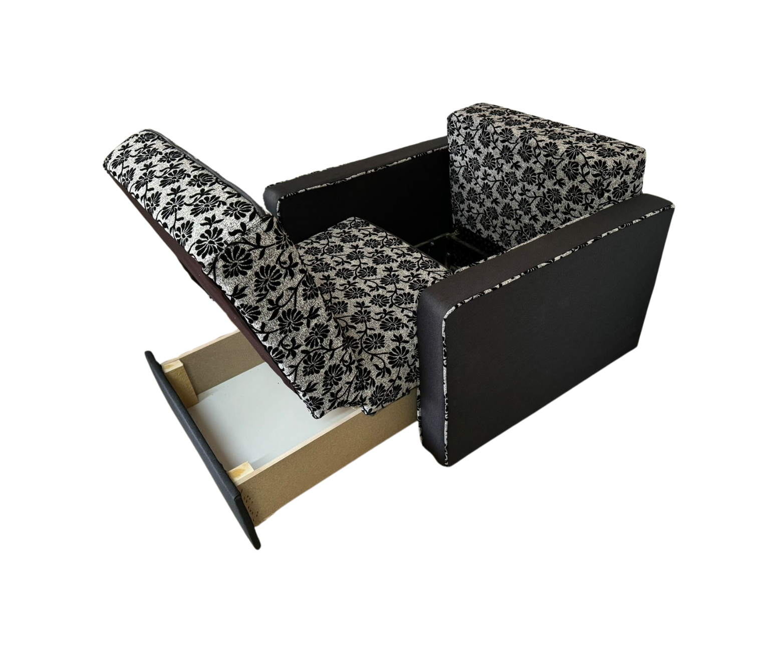 Construcția sa solidă include cadru metalic combinat cu lemn masiv și PAL, completat de spumă poliuretanică și miez elastic BONNELL. Această structură asigură susținere optimă atât în poziția de șezut, cât și în cea extinsă, oferind confort stabil și de durată. Mecanismul de extensie este foarte ușor de utilizat, transformând rapid fotoliul într-un spațiu de odihnă confortabil.