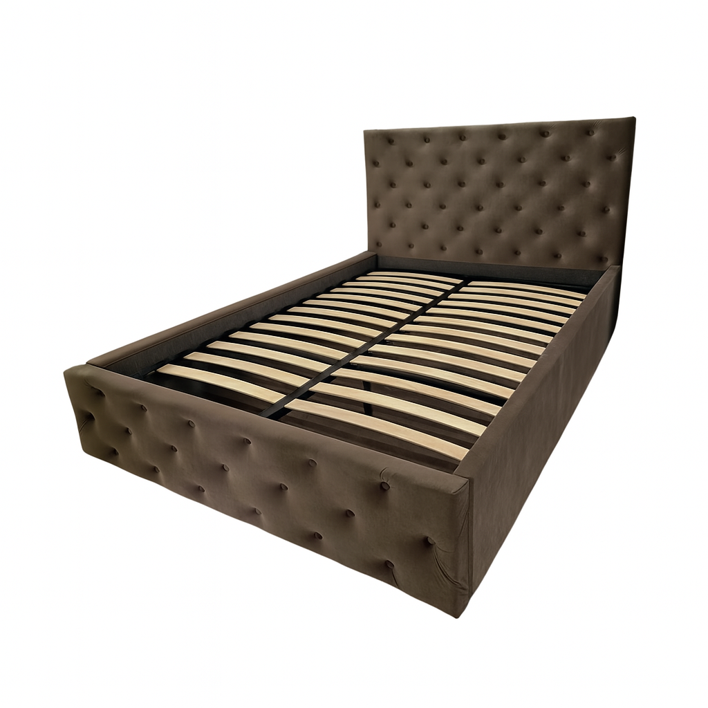 Pat tapitat Berlin cu somiera rabatabila si spatiu de depozitare, catifea maro , 180x200 cm